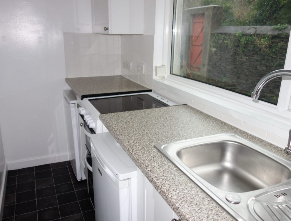 The kitchen has a fridge, freezer, cooker and washer dryer.